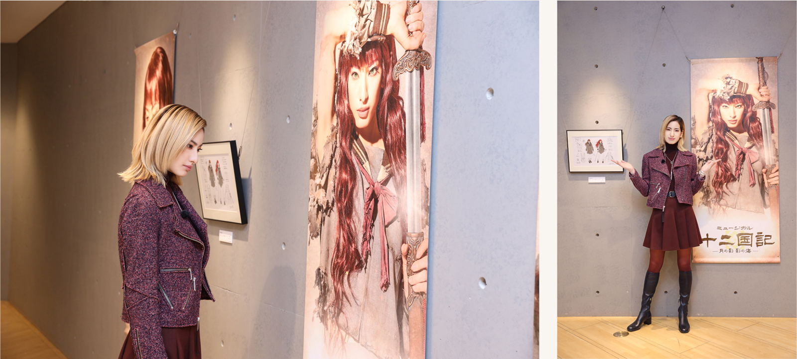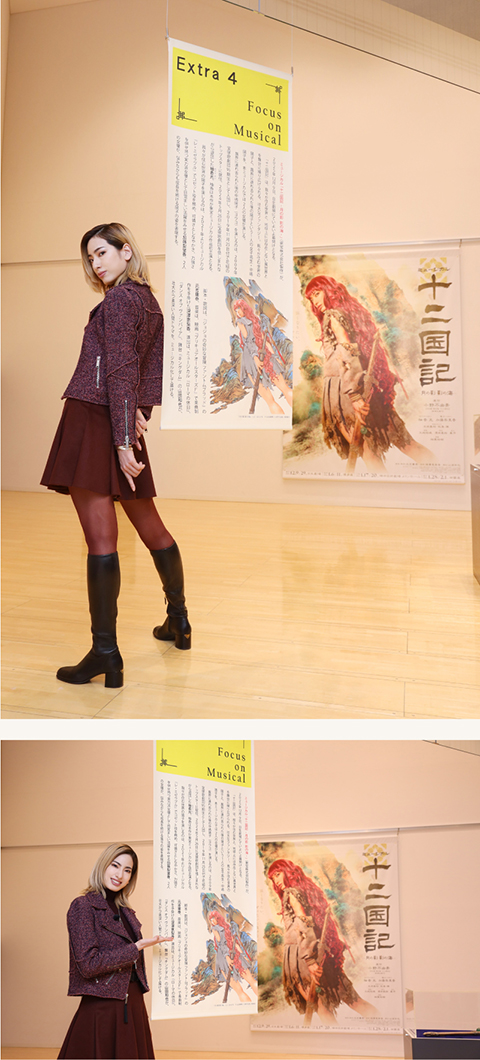 オマージュビジュアルとして自身が再現した装画の原画を食い入るように見つめ、「色味がより深く、立体感と迫力が凄いと思います」と柚香。原画に描かれた数々のポーズを真似ながら館内を巡り、「役作りの参考になりますし、目に焼き付けて、シルエットや眼差し、身体の使い方も体現したいという思いが凄くあります」と意気込んだ。