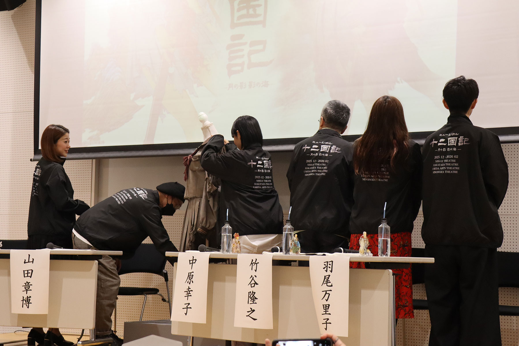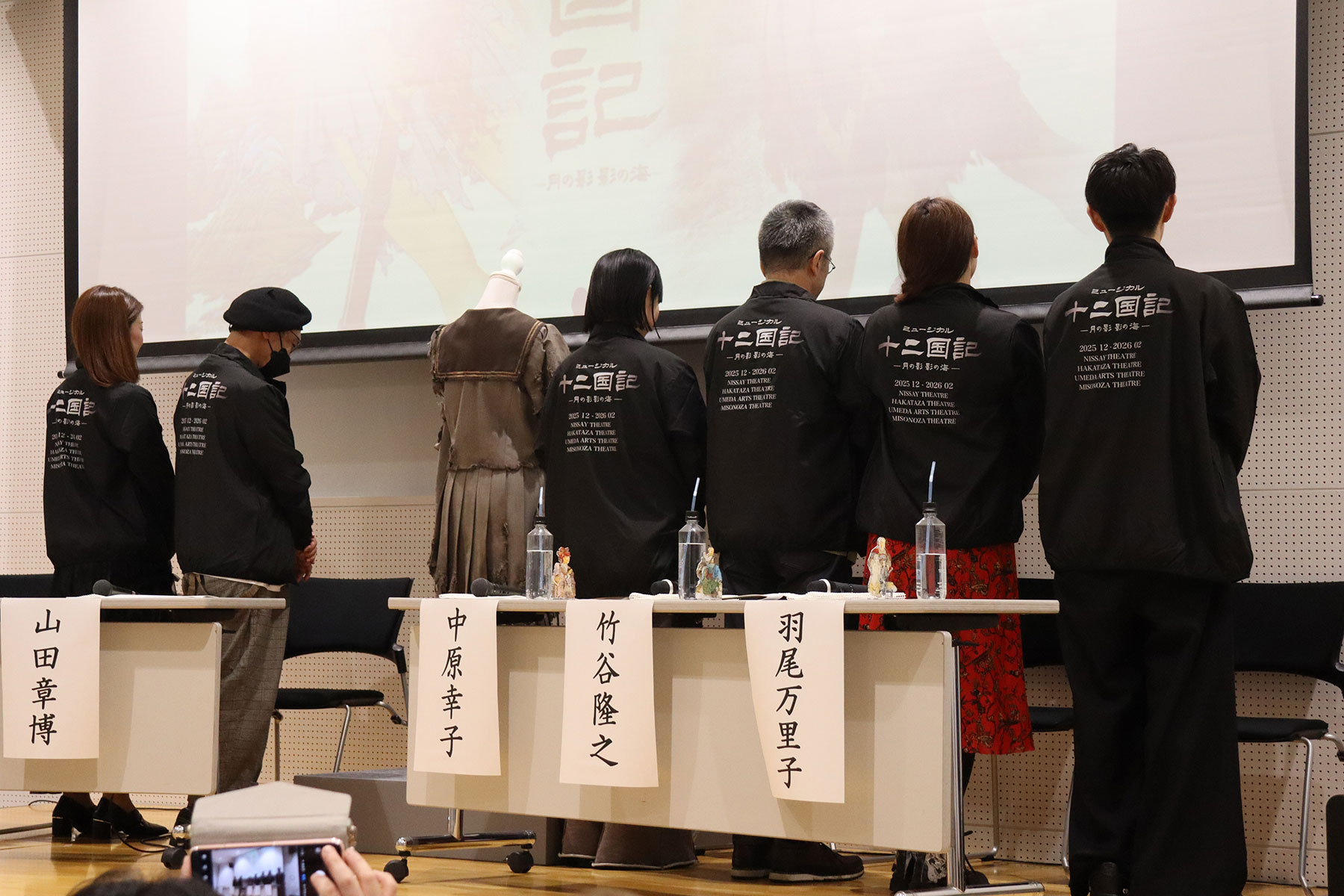 今回、トークショーの登壇者にはミュージカルのカンパニーウェアである黒のジャンパーを着用してもらっていたのですが、その背中に、「十二国記 -月の影 影の海-」の東京、福岡、大阪、愛知、の公演日程がプリントされていたため、MCが公演の説明を始めるや、なんと山田先生が自ら、くるっとお客様に背中を見せてくださる、という一幕が。