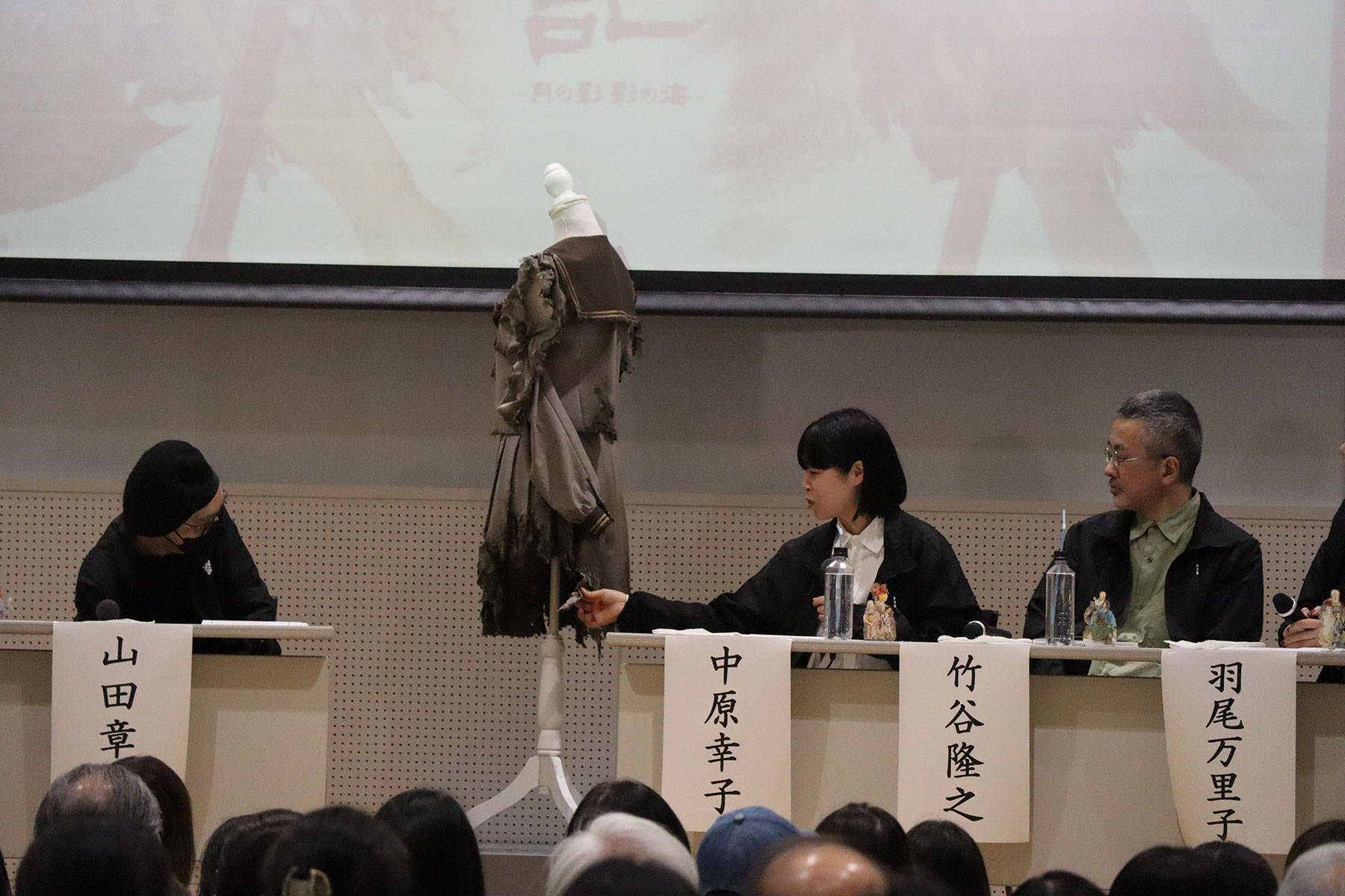 「山田先生の画は、風になびいた時のボリューム感とか、すごい美しいじゃないですか。この布なびきって永遠のテーマで、私の中で。イラストのようになびかせたいなっていうのがあるので。山田先生が見た時に納得していただけるように、今もずっと頑張っていますが。 あとは、甲冑だったり水禺刀なんかは竹谷さんや他の方にお願いしましたけど、それ以外のお面とか冠とか、人が着るもの身につけるものはトータル的にデザインをさせていただいてるので、そういうところも見ていただけたらいいなとは思います」