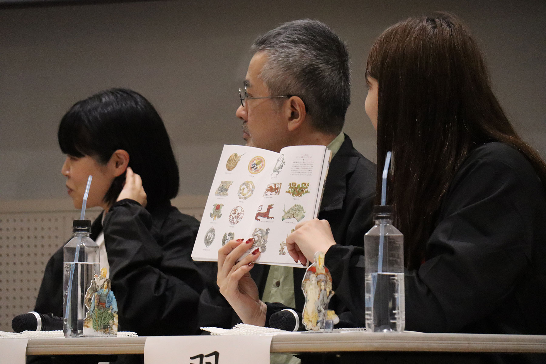 「あの、表4(裏表紙)の部分には、本編にあまり登場してないんだけど重要なキャラクターとかを描く場合もあるだろうと思うんです。(『十二国記』の場合は)世界観を補強しようってことで、担当さんと話し合って。それは、風景とかを描くんじゃなくて、意匠のペダントリーというか、そういうものを創った方が、世界観の補強になるんじゃないかって。現代にもありそうだなと思いましたけど、そのおかげか、グッズは作りやすかったみたいですね。