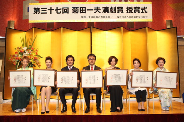「本当にこの賞を欲しい欲しいと思っておりました。ありがとうございます。月日はさかのぼりますが、ここにいらっしゃる受賞者の皆さんは生の菊田先生はご存じないかと思います。当時、私は映画の方の人間でしたので舞台はどうかなと思っておりましたところ、菊田先生が芸術座の『人間の條件』という舞台で抜擢して下さいました。当時、菊田先生の作品はすべてヒットしており、東宝現代劇と芸術座のスタートの時期で、私も菊田先生の厳しいご指導を頂きました。私はずっと映画に関わっておりましたので、舞台経験がなく不安を感じておりました。それが『人間の條件』以来、菊田先生の作品には11作連続で出演させて頂き、その後もずっと1年に2本は出演させて頂きました。あまり良い弟子ではなかったかもしれませんが、菊田先生の愛弟子だったかもしれないとこの賞を今日頂き、改めて嬉しく思っております。やっと舞台の賞を頂いて、これから私は舞台俳優としてスタートの時かなと思っておりますので、舞台関係の皆さま、ぜひ私を使って頂ければと…よろしくお願い致します(笑)。今まで私をご指導くださいました東宝、松竹からは私にピッタリの役を与えて頂きました。本当に皆さま、色々ご指導賜りまして、ありがとうございました。」 |