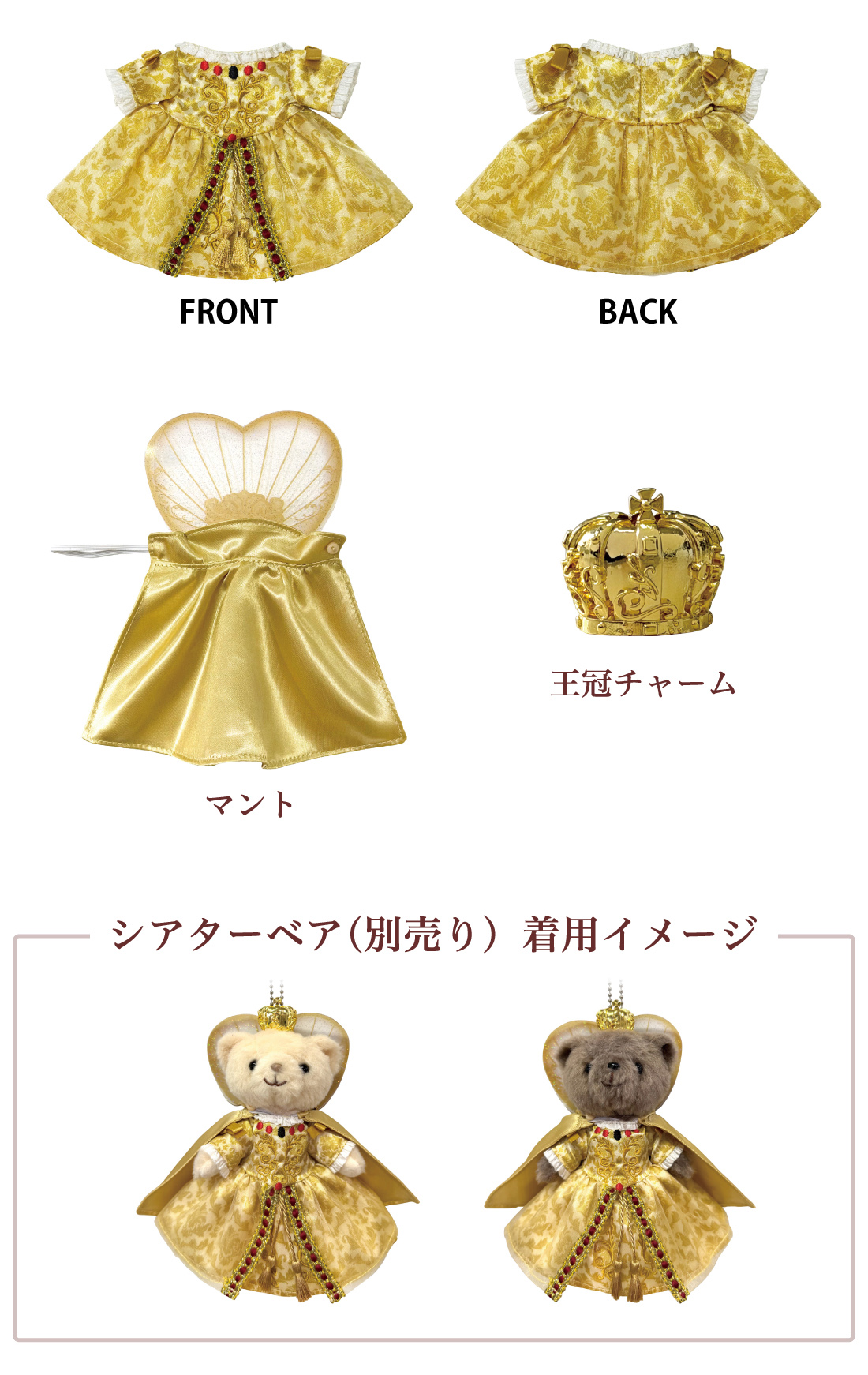 - [サイズ]ドレス:約H105mm、マント:約H160mm(PVC製飾り含む)、王冠チャーム:約W23×H23mm