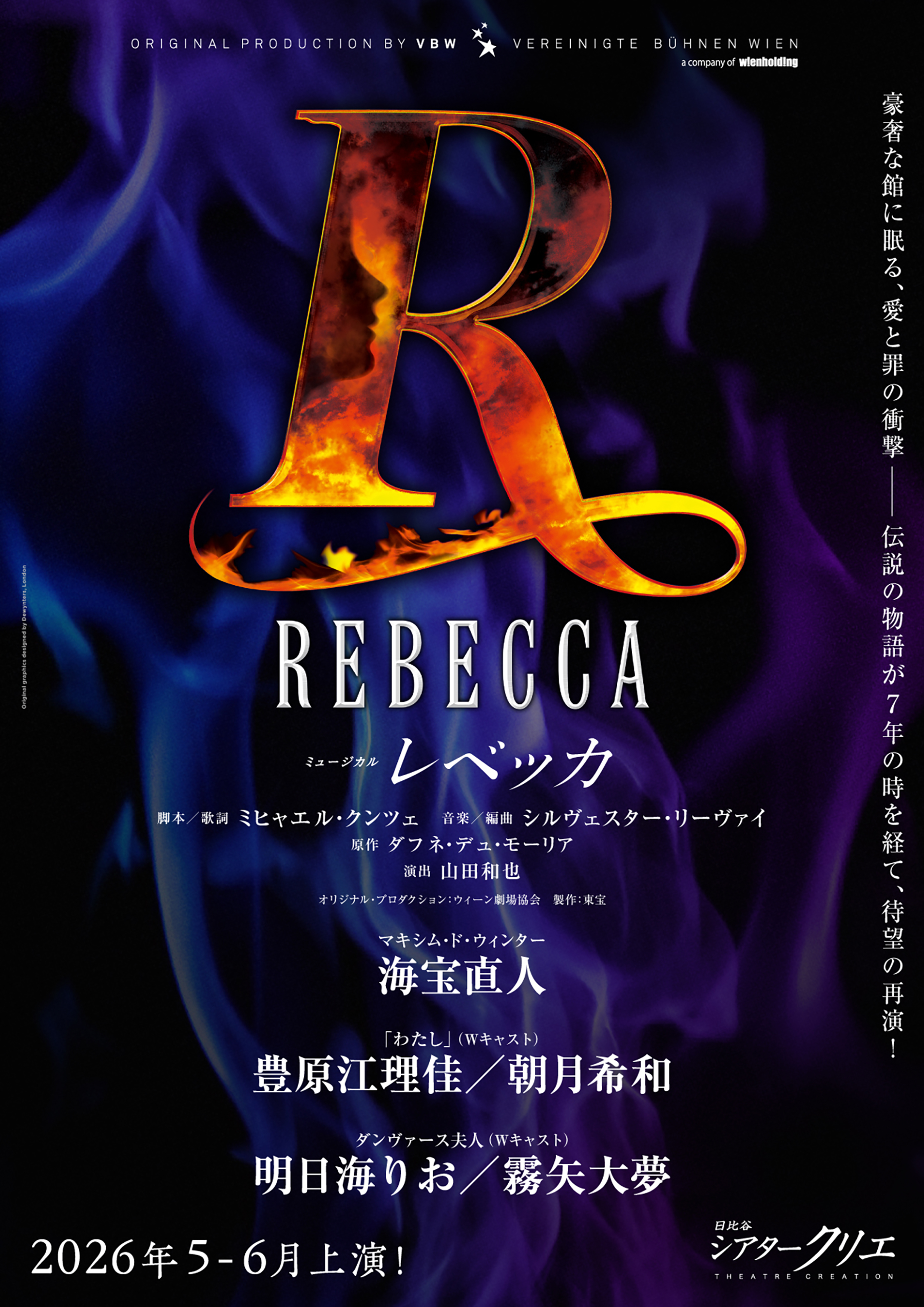 本作品は、イギリスの作家ダフネ・デュ・モーリアのゴシックロマンス小説を原作とした、サスペンスとロマンスが絡み合う重厚な作品であり、2008年4月に、シアタークリエ・オープニングシリーズのミュージカル公演第1弾として華々しく上演されました。コンパクトかつ濃密な劇空間で繰り広げられたロマンティック・ミステリーは約3か月、全日程完売御礼の大ヒットとなり、2010年4・5月には大劇場バージョンとして帝国劇場でも開幕し、大好評を博しました。その後も、2019年にシアタークリエ開場10周年記念ラインナップの締めくくりとしても上演されるなどの人気作品です。そして今回、満を持して7年ぶり4度目の上演となり、シアタークリエに帰ってきます!さらに7年ぶりの『レベッカ』はキャストを一新してお届けいたします!